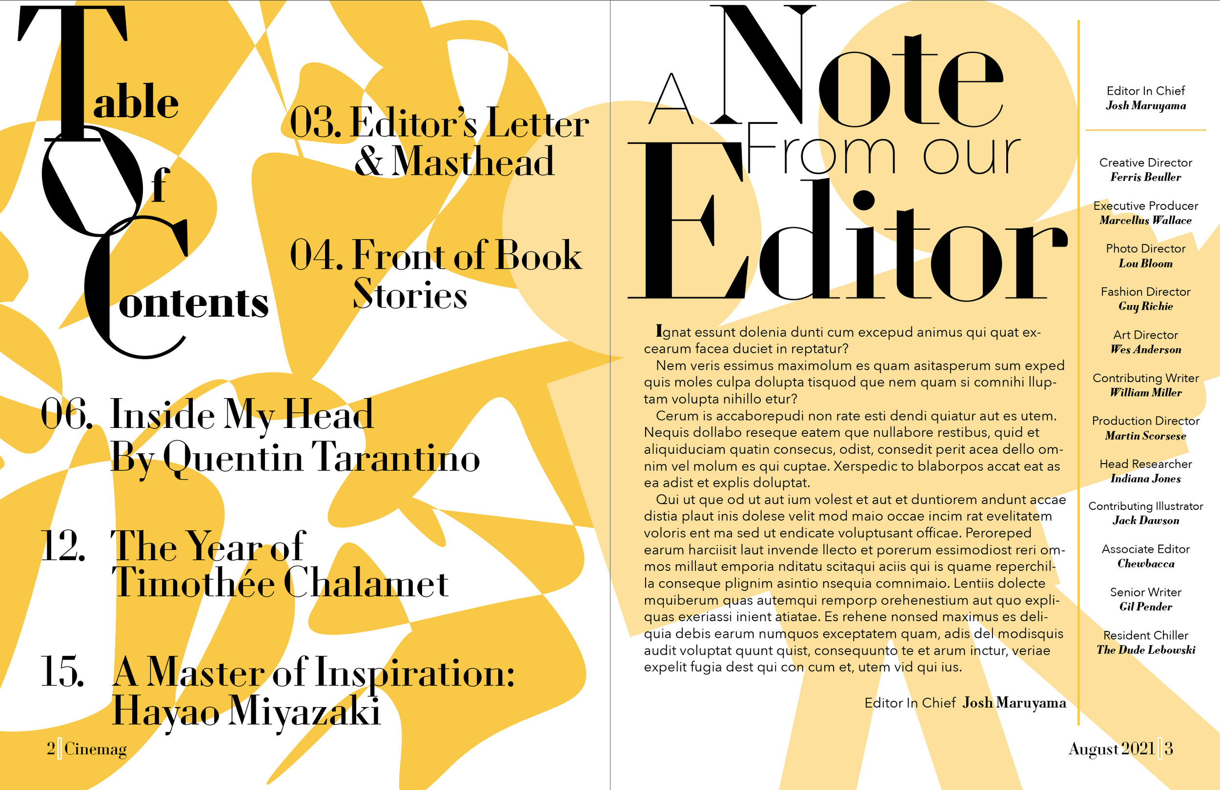 An edition of a mockup magazine I created as my final project for my Intro to Design course in 2021. I used my newly learned typography and layout skills in Adobe InDesign to highlight my passion for cinema and creative vision.